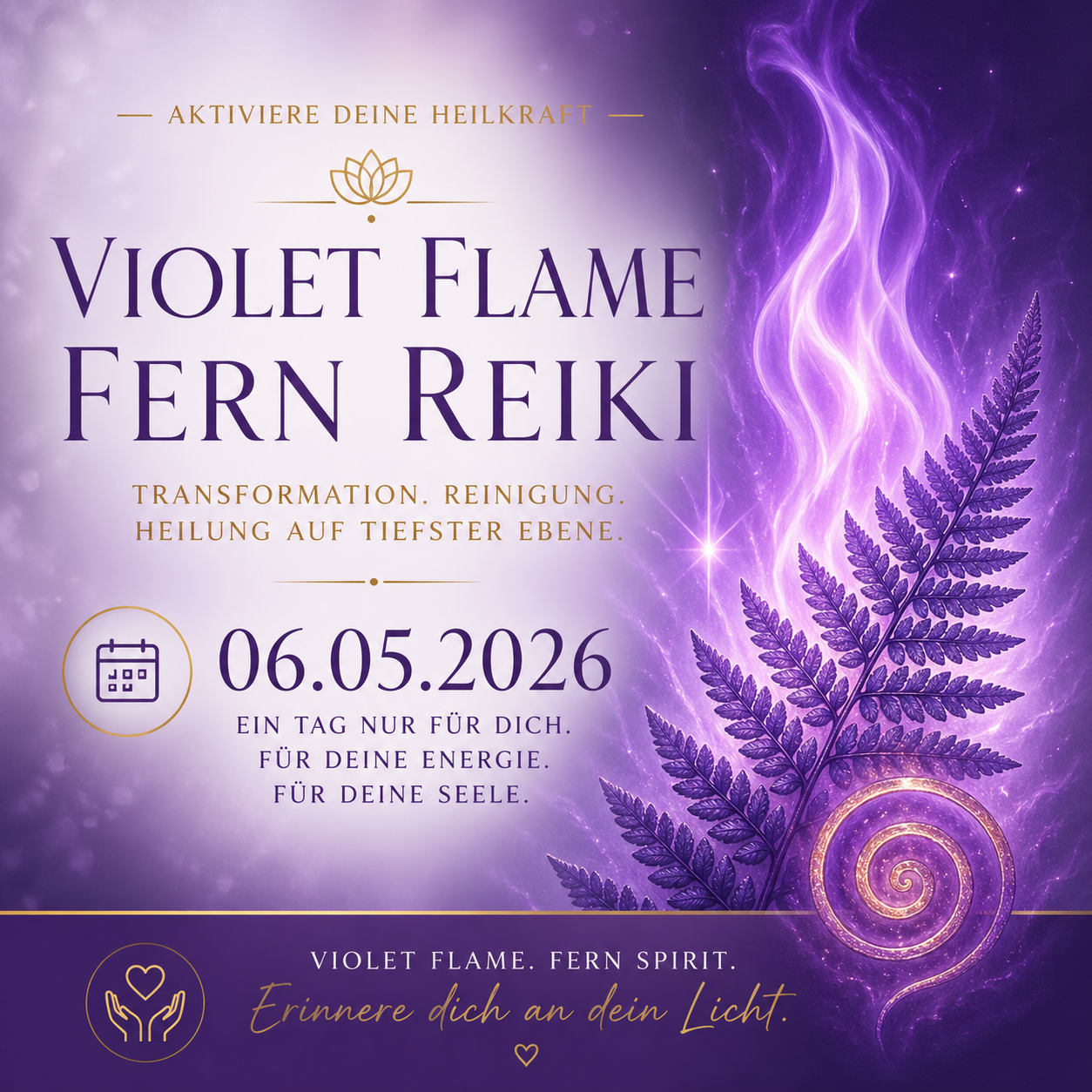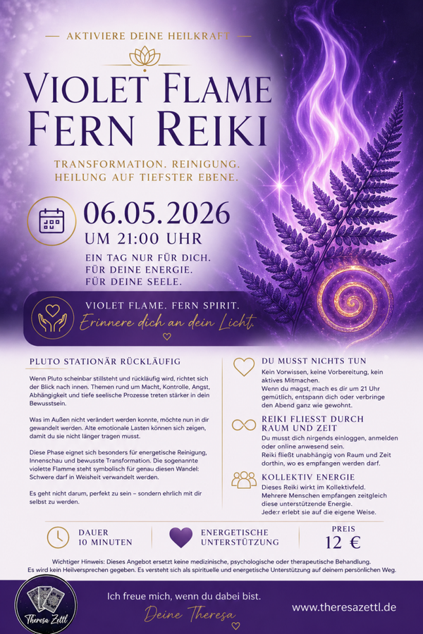 Am 06.05.2026 öffnet sich ein besonderer Raum für Wandlung, Reinigung und innere Klärung. An diesem Abend findet um 21:00 Uhr mein gemeinsames Violet Flame Fern Reiki statt – eingebettet in die kraftvolle Energie eines besonderen astrologischen Wendepunkts.